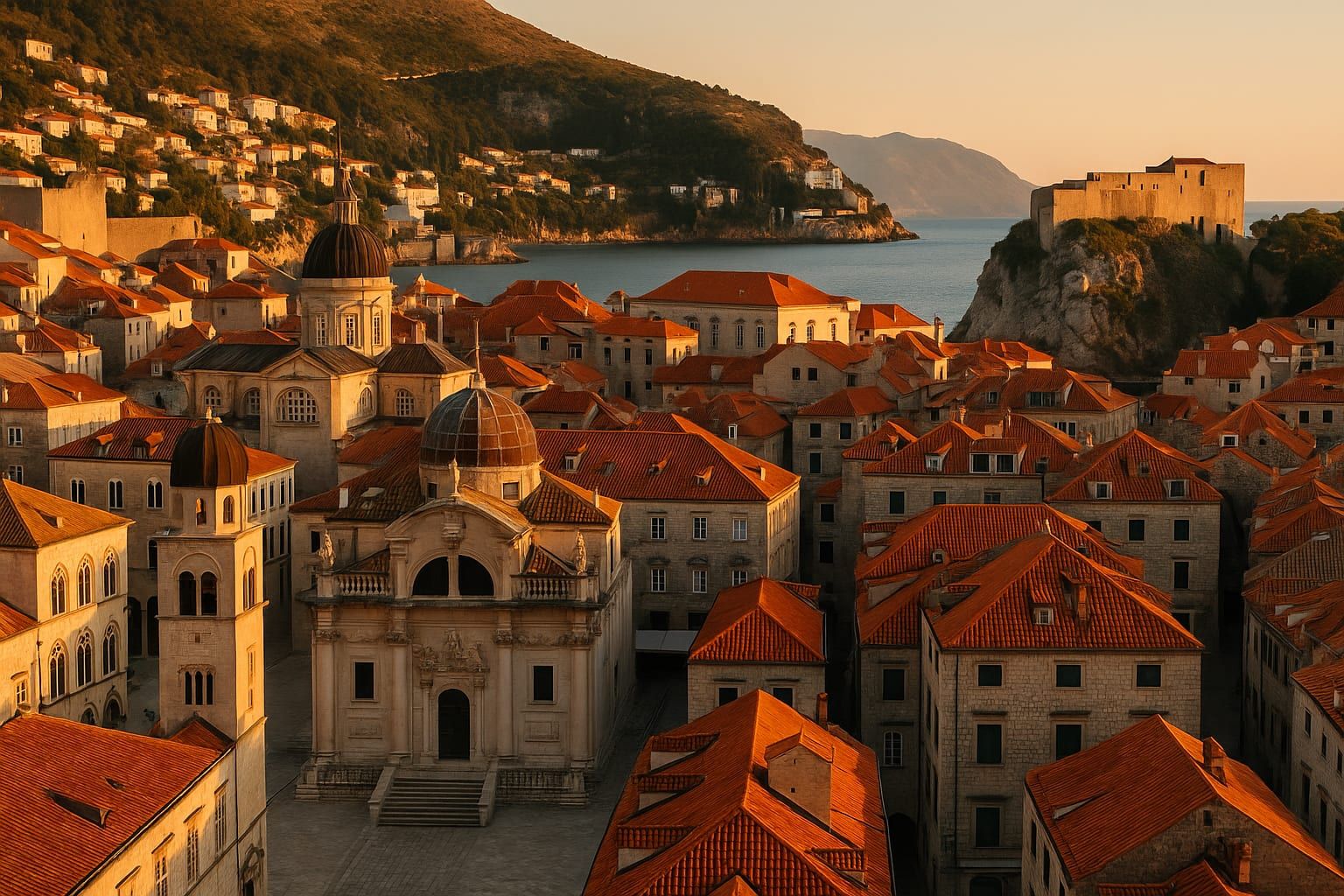 Montez en téléphérique de Dubrovnik ou en voiture jusqu'au mont Srđ pour le coucher du soleil. Le panorama sur la vieille ville à l'heure dorée est inoubliable — redescendez ensuite pour dîner.