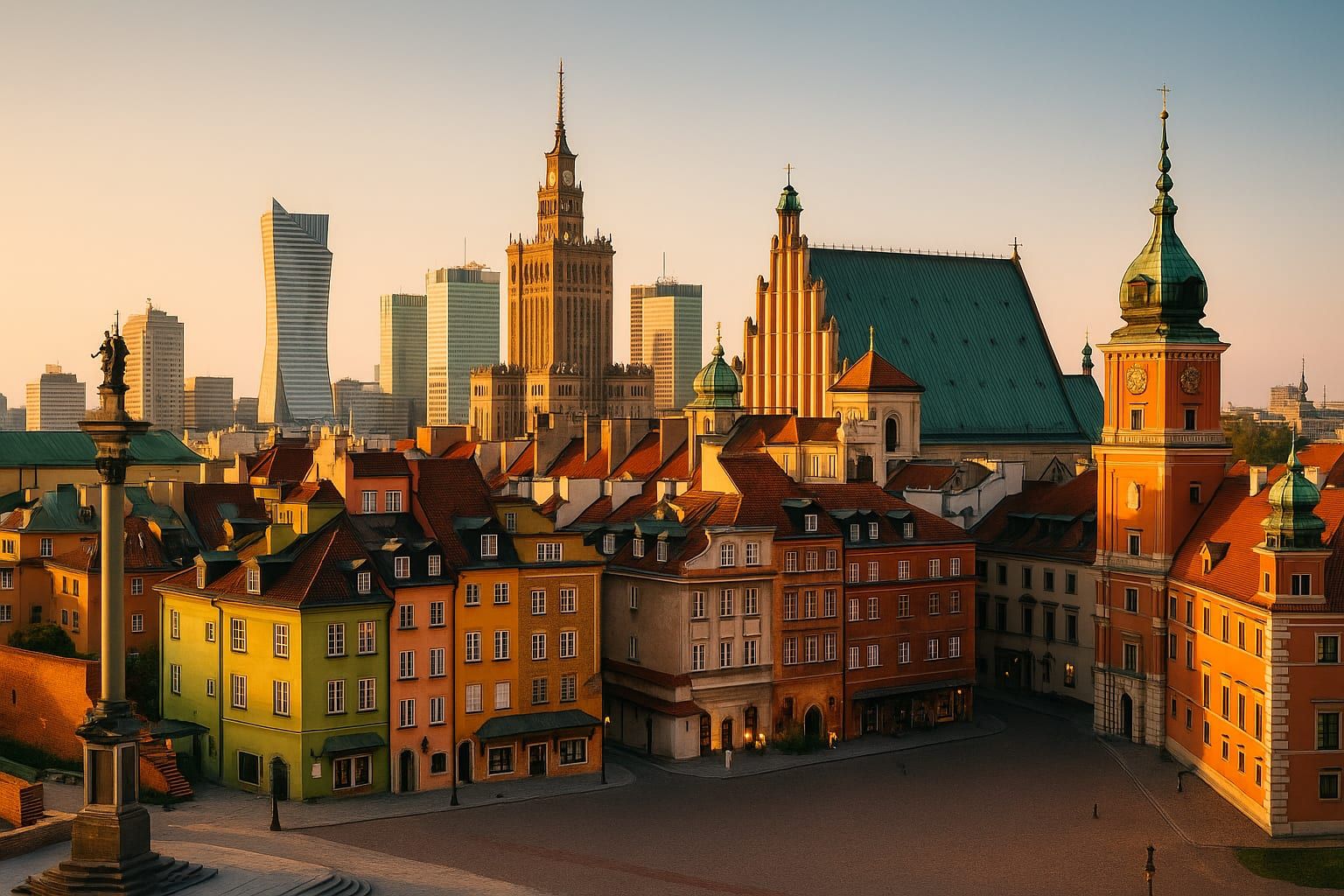 Iniziate nella Città Vecchia (Stare Miasto), il cuore della rinascita di Varsavia. Le strette strade acciottolate, le facciate pastello e la Piazza del Mercato sono state meticolosamente ricostruite dopo la guerra; il ricostruito Castello Reale conserva sale d'epoca e offre splendide vedute sulla Vistola. Prendetevi il tempo per osservare gli artigiani e gli artisti in piazza e fermatevi in un caffè per colazione — provate un dolce caldo e un caffè polacco forte.